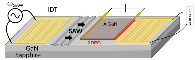 The aim of this project is to explore novel opportunities when coupling acoustic waves to an electron gas through the acoustoelectric effect. A simplified device architecture is presented in Fig. 1. IDTs launch a surface wave on a piezoelectric material (here GaN). The acoustic wave propagates through an electron gas hosted in a mesa structure connected with DC leads, imposing a current and thus dragging the electrons. If the electrons and acoustic wave move in opposite direction, strong absorption of the acoustic wave is observed. However, when the electrons and the acoustic waves co-propagate with an electron drift velocity greater than the acoustic wave speed, amplification of the acoustic wave can occur.